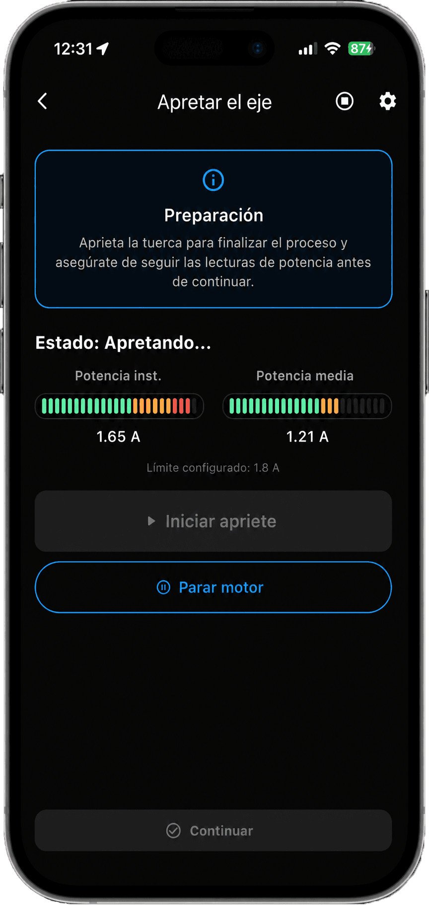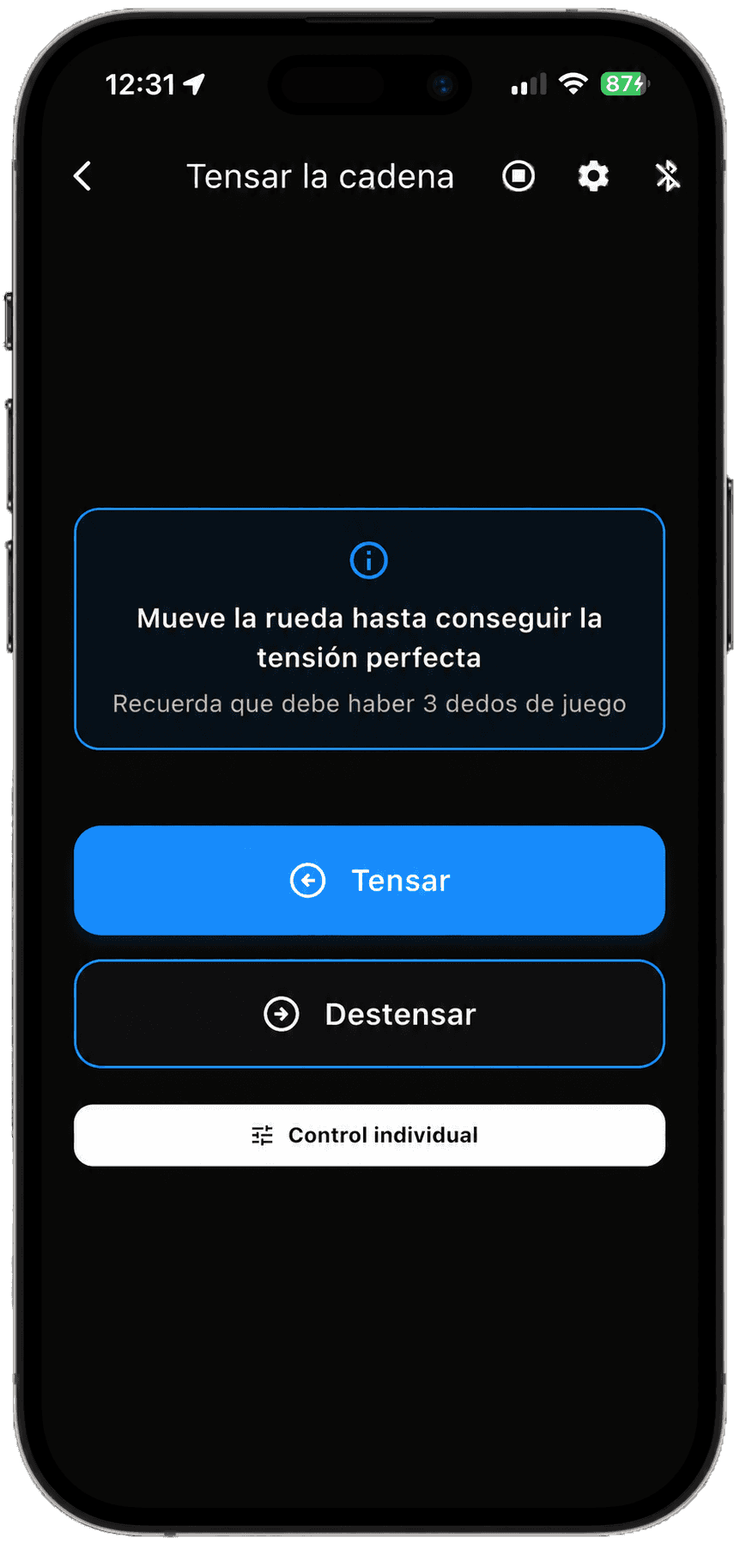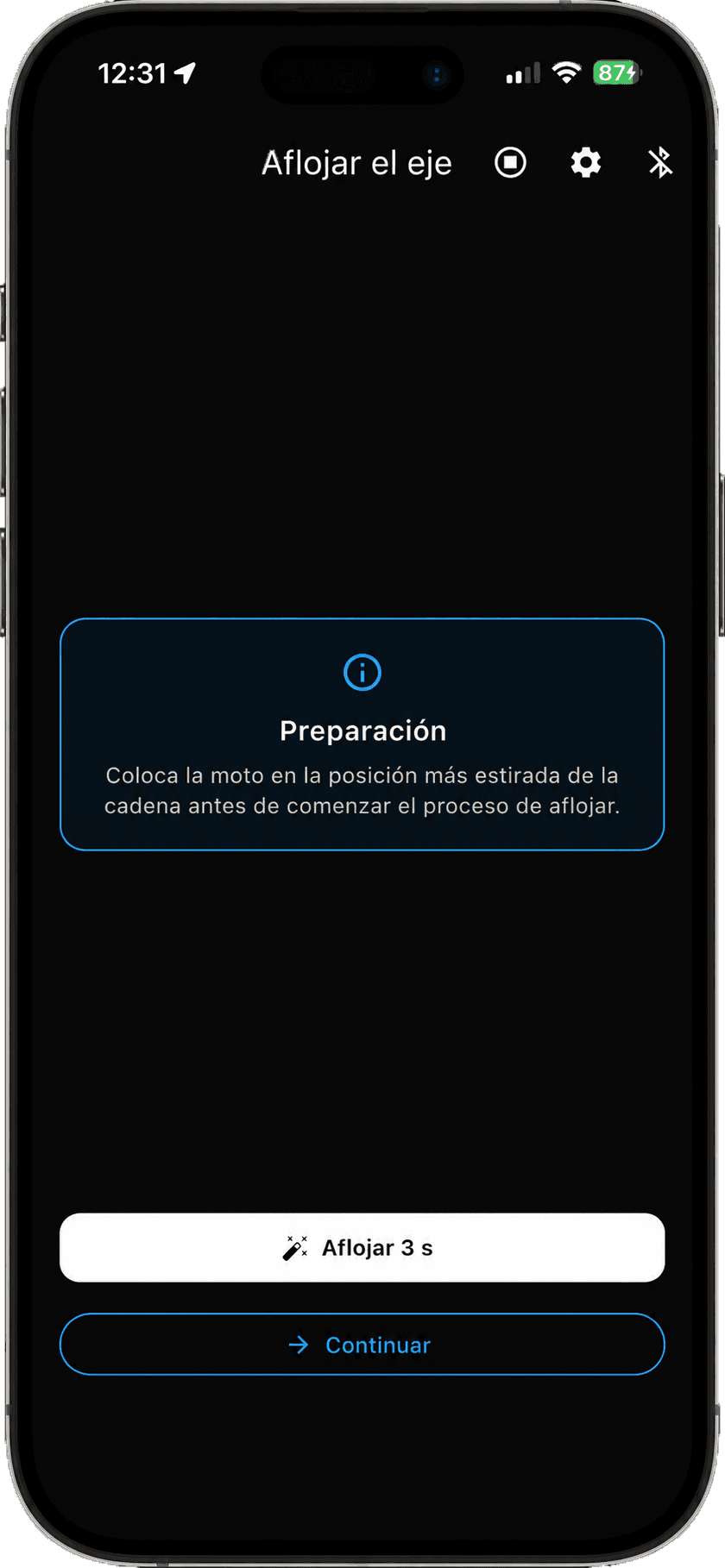 Conecta la App con la moto y sigue las indicaciones. El primer paso es aflojar el eje